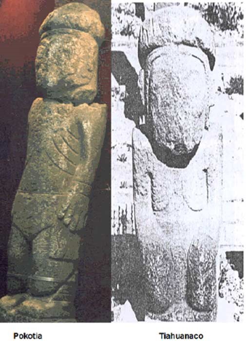 Ainda mais da influência suméria nos antigos sistemas de escrita sul-americanos, é interessante destacar que a estátua de Pokotia e os monumentos de Tiahuanaco apresentam toques similares, assim como marcas ao modo das costelas e ao longo do peito. Essa coincidência revela a relação entre os construtores desses monumentos.