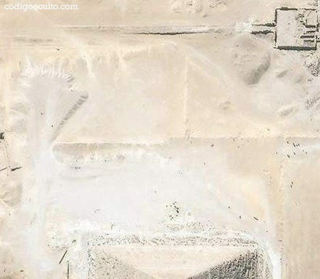 Mas isso é somente à primeira vista. Se ampliar os detalhes dessa imagem, pode encontrar os contornos apenas percebidos de formações retangulares, gigantes, claramente artificiais, que se encontram na frente das famosas pirâmides.
