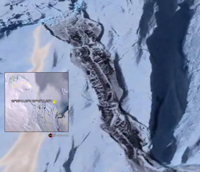 As seguintes são as coordenadas desse estranho achado até agora indecifrável. Coordenadas do Google Earth: 69°53’40.85″S 38°42’18.25″E.