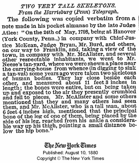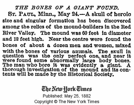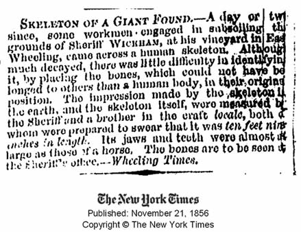 Os trabalhadores que participam nos trabalhos da via férrea, encontraram-se com uma tumba que continha os esqueletos dos que se crê foram os nativos americanos de uma época antiga e uma raça humana perdida e esquecida. Os corpos exumados eram de formação estranha e notável. […]. O fêmur é muito mais comprido que o dos indivíduos humanos normais, a estatura do corpo que é, provavelmente, tão grande como 2.5 metros e 3 metros.