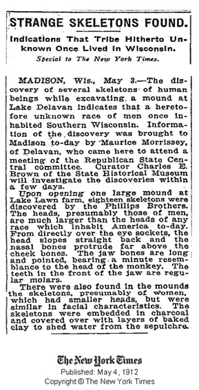 O descobrimento de vários esqueletos humanos enquanto se escavava uma colina no Lago Delevan indica que uma raça de homens até agora desconhecida uma vez habitou no sul de Wisconsin. […]. As cabeças, provavelmente desses homens, são muito maiores que as cabeças de qualquer raça que habita América hoje em dia.