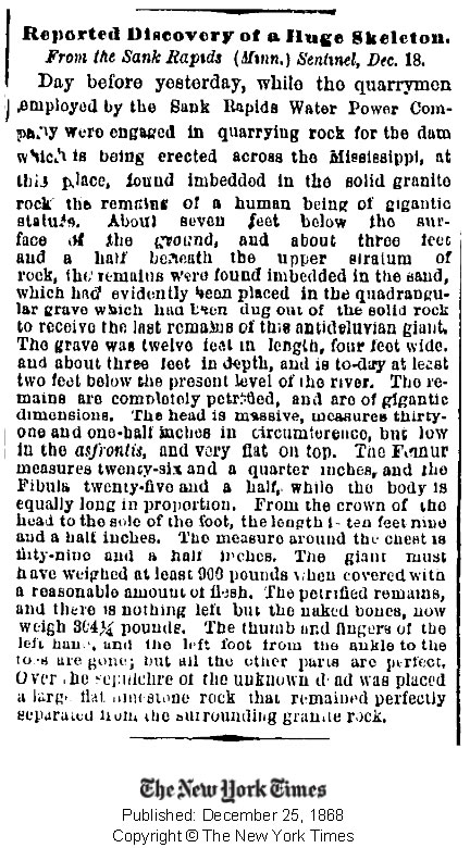 No dia de Natal do ano 1868, o New York Times informa de outro achado de gigantes. Trabalhadores da companhia Sank Rapid Water Power enquanto realizavam escavações para a construção de uma represa para gerar energia hidroelétrica ao longo do rio Mississipi, desenterraram os restos de um esqueleto humano incrustado em uma gigantesca rocha de granito.