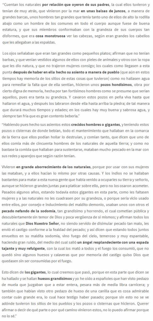 … As Serras nevadas que chamam Razu, ou por sincope Rao, ou Ritri, que tudo que deseja neva, e também nas casas dos Huaris, que são os primeiros povos daquela terra, que eles dizem foram Gigantes, e é certo que em algumas partes o foram, e se acha ossos deformados e incrível grandeza, que quem não o vê, nem a toca com as mãos, não o acreditará, porque se mostram pela proporção dos esqueletos, ter tido tanto maiores que os homens de hoje.