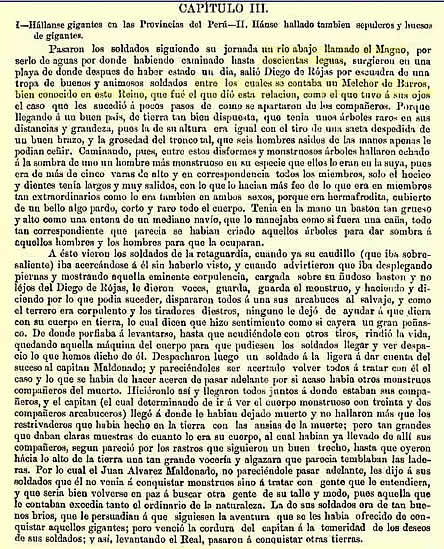 Na seguinte imagem vemos o texto do padre Cristóbal de Acuña que acompanhou a expedição de Pedro de Texeira de volta pelo rio Amazonas no ano de 1639. Esse sacerdote pôde ver os gigantes nas cabeceiras do atual rio Purus.