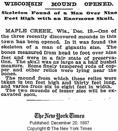 Em 20 de dezembro de 1897, o New York Times torna conhecido o primeiro descobrimento de gigantes que foram realizadas em Wisconsin, perto de Maple Creek. Descobriram-se três colinas utilizados como funeral, um das quais estava aberta, deixando ver seu conteúdo: um esqueleto de um homem gigante. A altura do ser era aproximadamente de três metros, e se encontrava em bom estado de conservação.