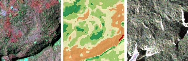 A área inicial de nossa investigação foi de aproximadamente 1300km² (502 milhas quadradas). Depois de cartografar a adequação dos assentamentos, reduzimos drasticamente a área da investigação. Se concentrando em zonas muito adequadas, a equipe estudou imagens de alta resolução em diferentes faixas espectrais: visível, infravermelho próximo e micro-ondas. Isso revelou padrões e estruturas que se interpretaram como possíveis sítios arqueológicos. Alguns deles indicam-se na continuação. Essas três imagens cobrem a mesma área, mas ressaltas diferentes aspectos: imagem ótica multiespectral, mapa de adequação de assentamento e imagem de radar.