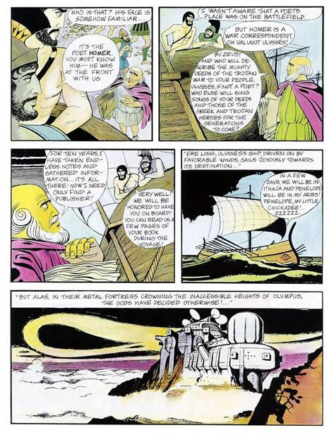 Por volta de 1970, o cartunista Georges Pichard e Jacques Lob criaram uma adaptação gratuita em quadrados da famosa Odisseia, na qual o próprio Homero aparece como uma espécie de repórter cego, carregando um gravador onde registra as aventuras de Ulisses. Nessa Odisseia modernizada, os deuses são cosmonautas a bordo de uma nave-mãe estacionada no cume coberto do Monte Olimpo. Eles observam, decidem, por meio de monitores a bordo, os movimentos dos terráqueos na superfície e decidem como intervir em suas vidas. E, por meio de suas próprias unidades de transporte, descem à Terra e interferem diretamente nos acontecimentos.