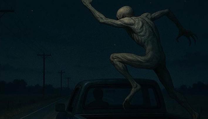 Enquanto estava na linha com a operadora do 911, a situação deu uma reviravolta dramática. O motorista ouviu um forte golpe na parte traseira de sua caminhonete e, aterrorizado, percebeu que algo havia pulado para dentro da caçamba do veículo. A criatura começou a bater e arranhar o teto da cabine. O homem acendeu a luz da caixa de carga e o que viu o deixou paralisado: um rosto “branco como a neve” pressionado contra a janela traseira. Ele descreveu a criatura com olhos afundados, sem nariz nem orelhas, e com uma pele que parecia esticada finamente sobre um crânio humano.