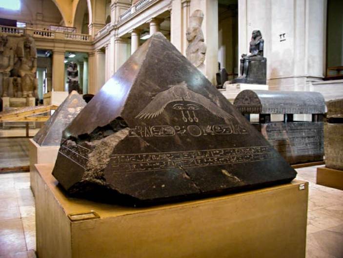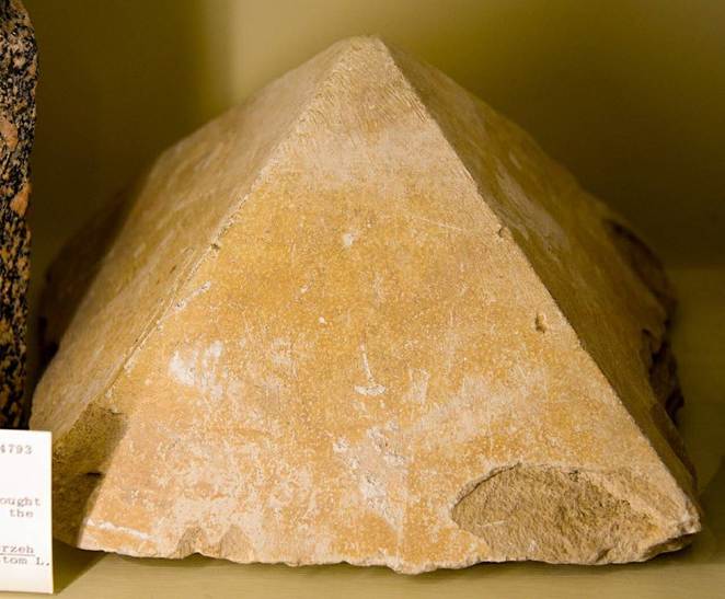 O piramidion, que é a pedra angular de uma pirâmide ou obelisco, estava coberto de inscrições e símbolos religiosos. Alguns deles foram apagados, o que levou os pesquisadores a concluírem que o piramidion nunca foi utilizado ou foi desfigurado durante o reinado de Akhenaton.